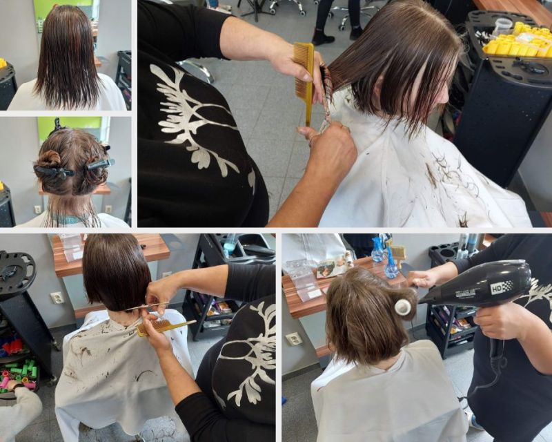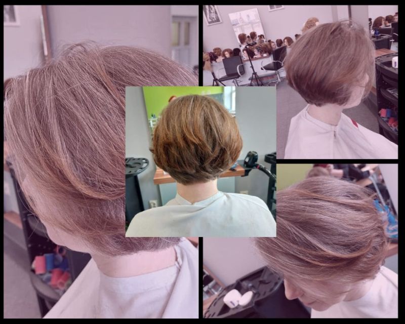 Fryzura, według życzenia klientki, miała być lekka w uczesaniu. Włosy zostały ostrzyżone do linii karku, następnie cieniowane i degażowane. Po lekkim wymodelowaniu i ukształtowaniu fryzury, włosy nabrały objętości i lekkości. Klientka zadowolona.